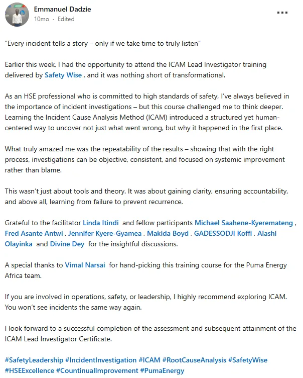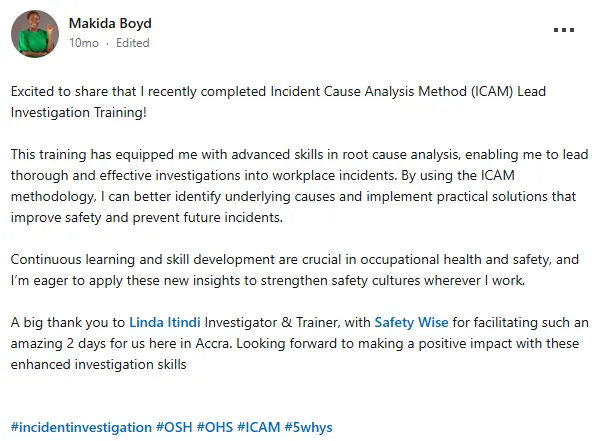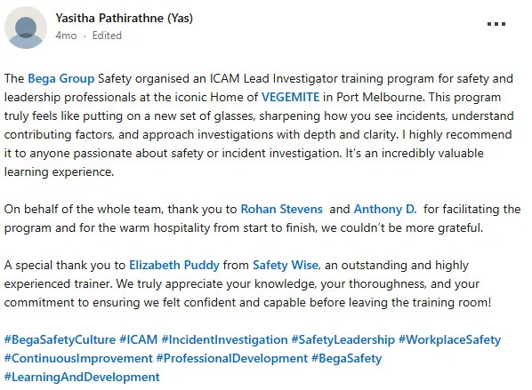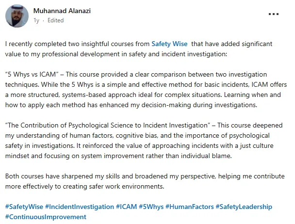 Consider what you're already spending: ICAM training per person, investigations that don't go deep enough, corrective actions that don't prevent recurrence, and the cost of a serious incident that wasn't fully understood, and happened again. The Mastery Program costs less than most organisations spend on a single external investigation review. If you need a business case, we'll help you build one.